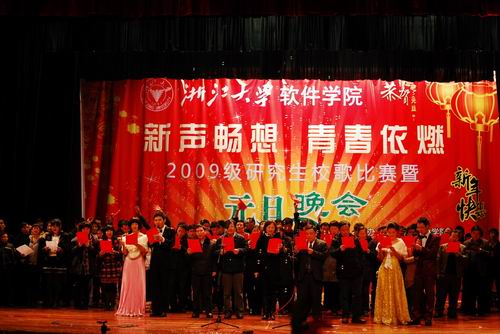 12月29日晚6点,软件学院2009级研究生校歌合唱比赛暨元旦晚会在学院学术交流中心拉开帷幕。软件学院院长陈纯、计算机学院与软件学院党委主持工作副书记冯雁、软件学院副院长干红华、杨小虎,老领导汪益民研究员、孔繁胜教授等与学院全体师生齐聚一堂,共同观看了校歌合唱比赛和元旦晚会。