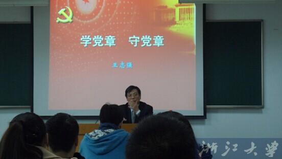 王老师首先阐述了党章的地位和作用,中国共产党党章是把握党的正确政治方向的根本准则,是党员加强党性修养的根本标准,是从严治党方针的根本依据。其次,从一大的《中国共产党第一个纲领》到十七大将科学发展观写入党章,王老师悉数了党章的修改历程,也让我们清楚地看到,建党80多年来,中国共产党紧跟时代发展步伐,不断总结新的经验,并将经实践检验证明正确的结论写入党章,通过不断修改党章,调整党的奋斗目标,在思想上、理论上与时代共同进步。最后,王老师重点为大家解读了十八大新党章,新党章修改主要集中在六方面:一是对科学发展观作出新的定位和阐述;二是充实完善中国特色社会主义重要成就的内容;三是充实了坚持改革开放的内容;四是充实了中国特色社会主义总体布局的内容;五是充实完善关于党的建设总体要求的内容;六是对部分条文作了适当修改。党章修改充分体现了党的事业总体布局和战略部署的与时俱进,形成的“五位一体”的社会主义总体布局表明了党的执政能力和自身建设上的长足进步,“宁要青山绿水,不要金山银山”,提出了建设生态文明,建设魅力中国的战略任务。