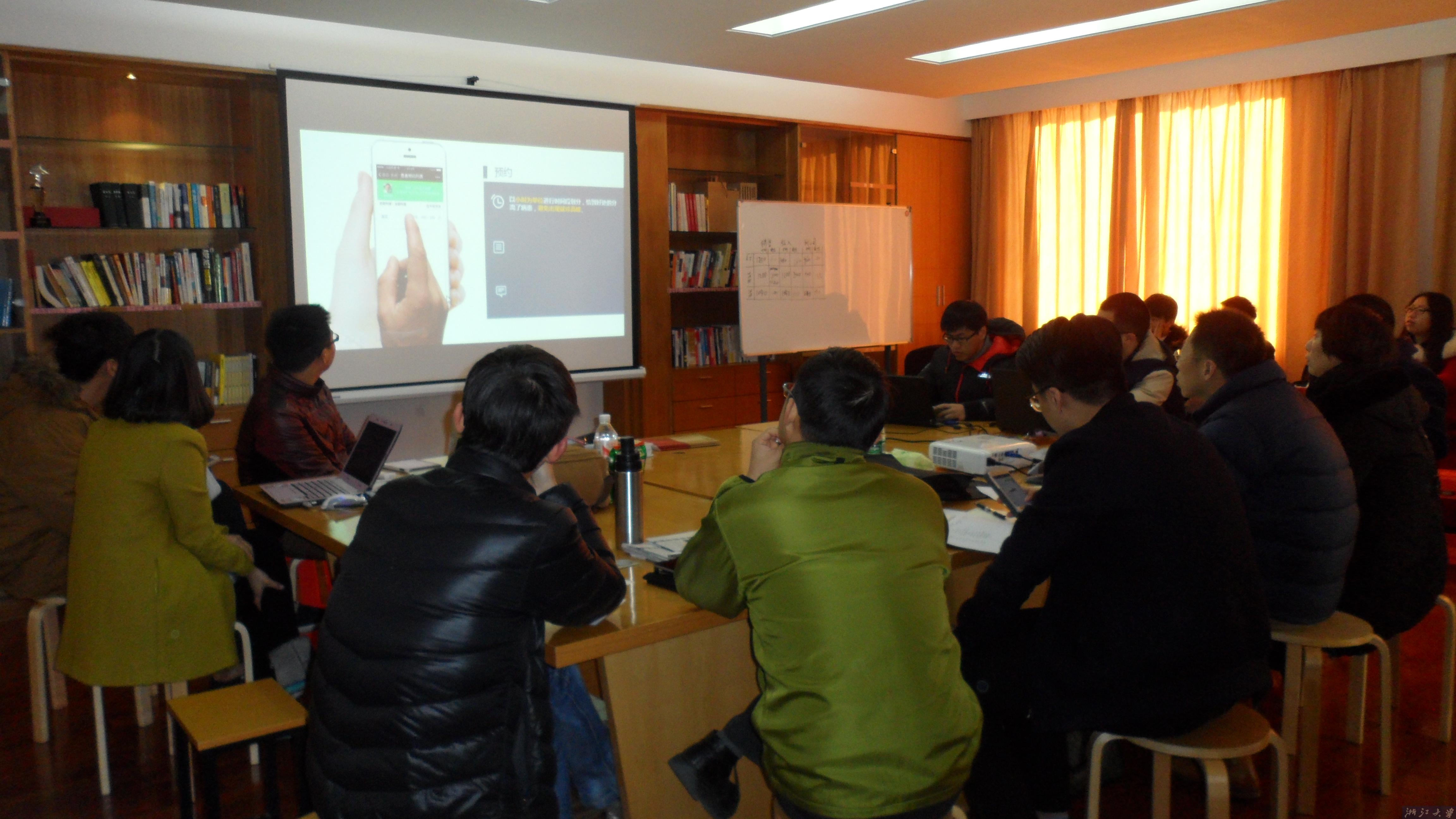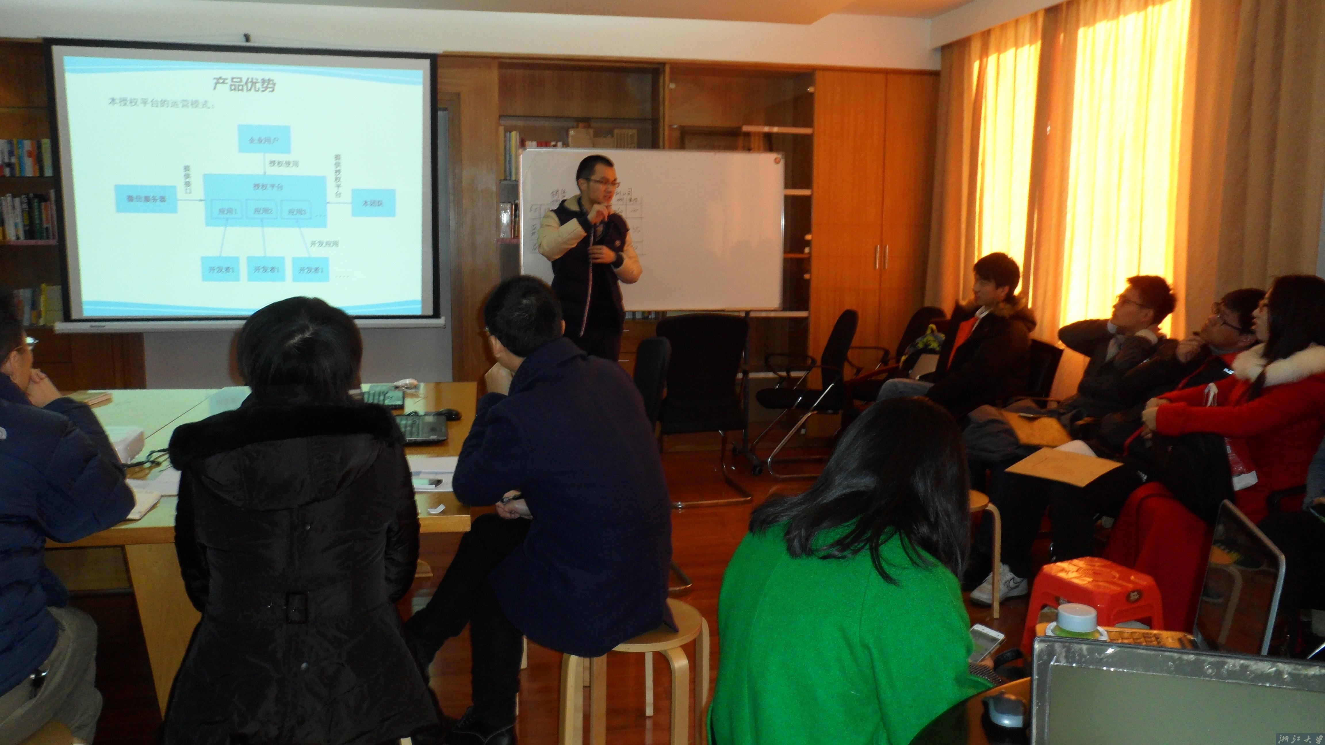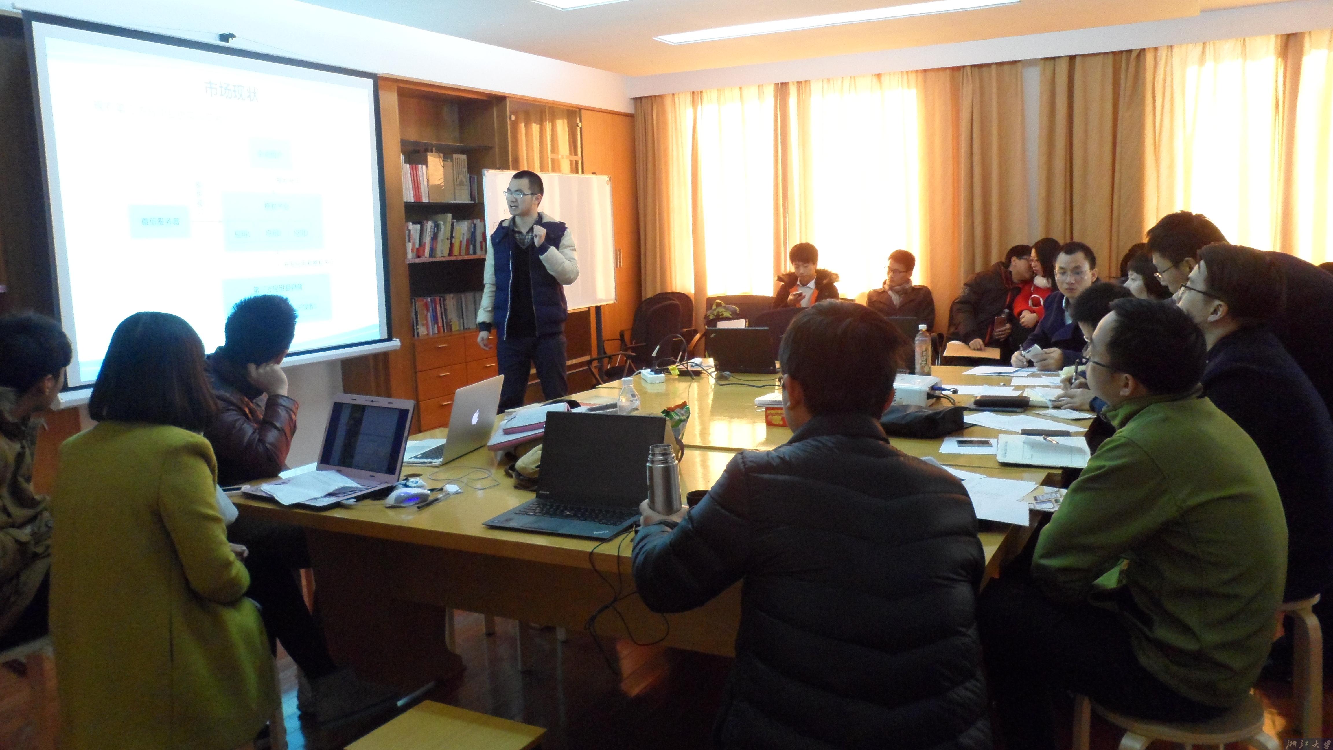 根据抽签,答辩顺序依次为潘烨《院外医疗关怀系统》、马萌《TWO跨屏游戏》、郑贤伟《微信企业号第三方服务平台》、陈悦《D’S设计公司》、周济遥《Phantom Photo》、王继政《三智智能科技有限公司》、傅元键《“简爱”创意礼品网站》、江瀚《微信群助手》、张梦海《“艺宝”艺术教育020系统》、王建荣《智慧酒店云平台系统》、林娣《鼓动》、姜冰浩《约摄夫校园摄影约片平台》、刘洋《Pose相机》,各团队五分钟时间讲解创业项目核心内容,评委现场互动、提问。