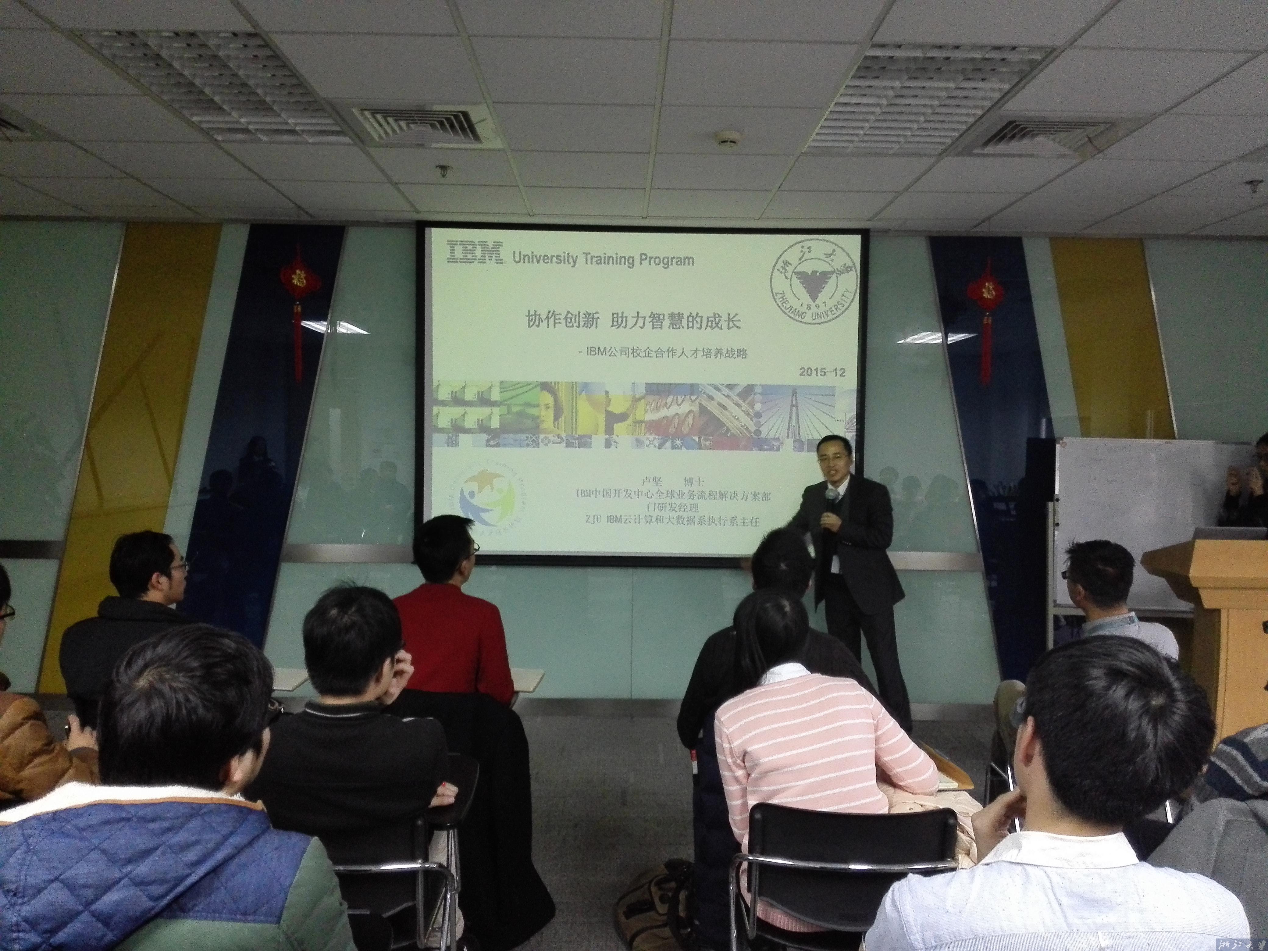 接下来,IBM的卢坚博士就《IBM与高校合作》主题进行了演讲。作为软件学院IBM云计算和大数据系执行系主任,卢坚博士对IBM与国内高校合作历史,特别就宁波IBM与浙大软件学院的合作进行详细介绍。并对云计算及大数据时代下的战略转型提出了自己的看法。