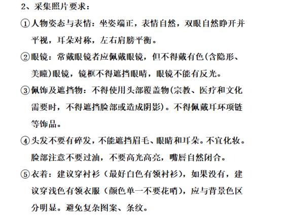 (2)请按影像拍摄要求(详见附图)免冠、着正装;注意保持着装和容貌整洁,不穿黄色、蓝色无袖上装,不佩戴任何饰物,露出眉毛和耳朵。